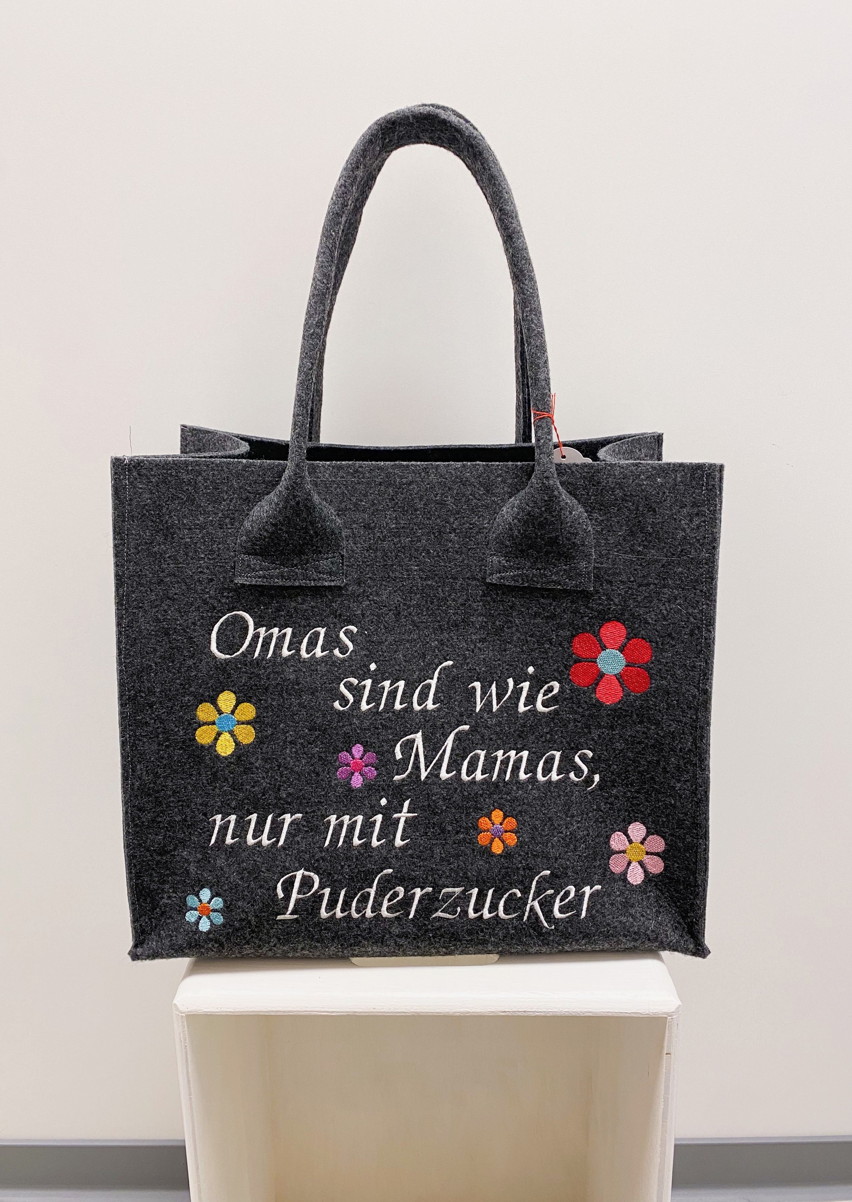 Unsere selbst genähten Taschen aus Filzstoff lassen sich mit einem unserer vielen Sprüche und weiteren Motiven besticken.