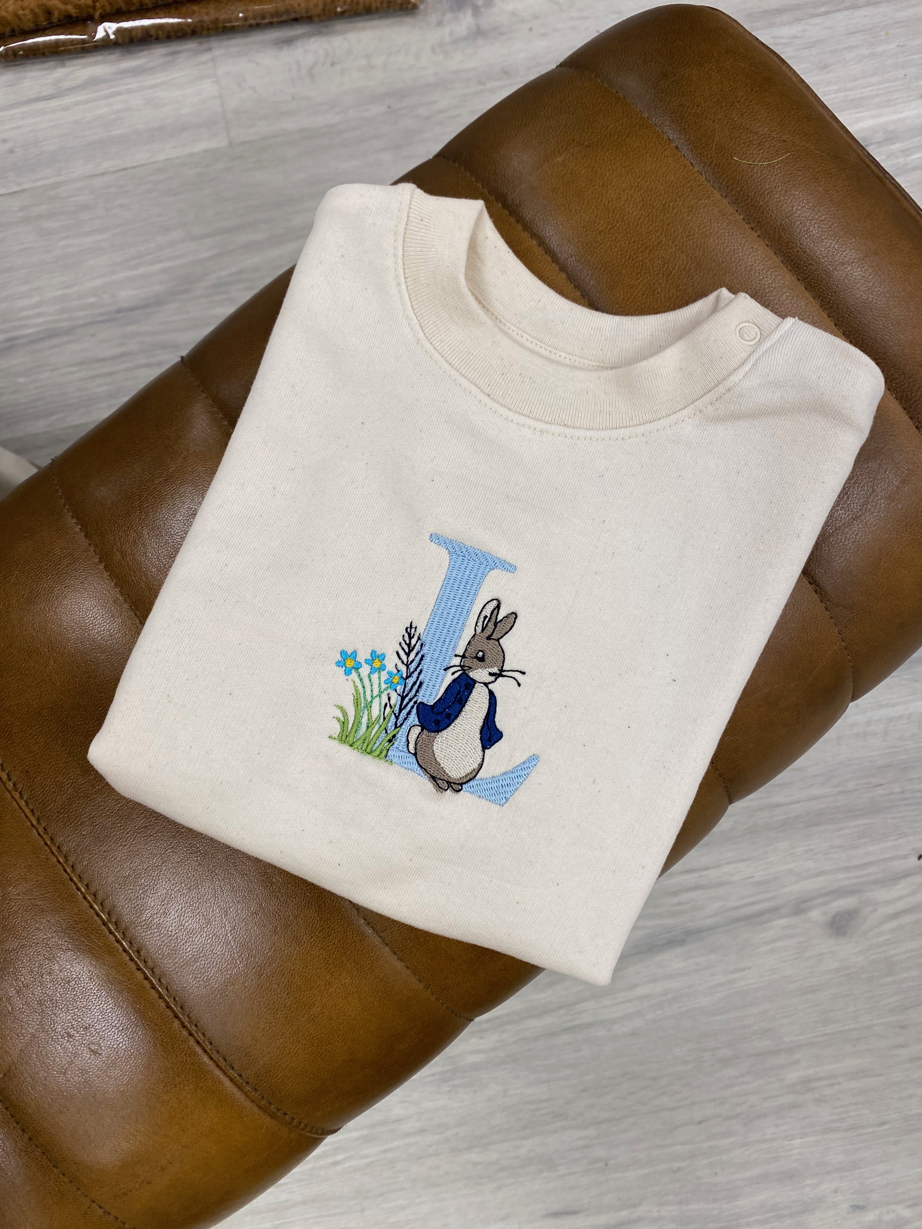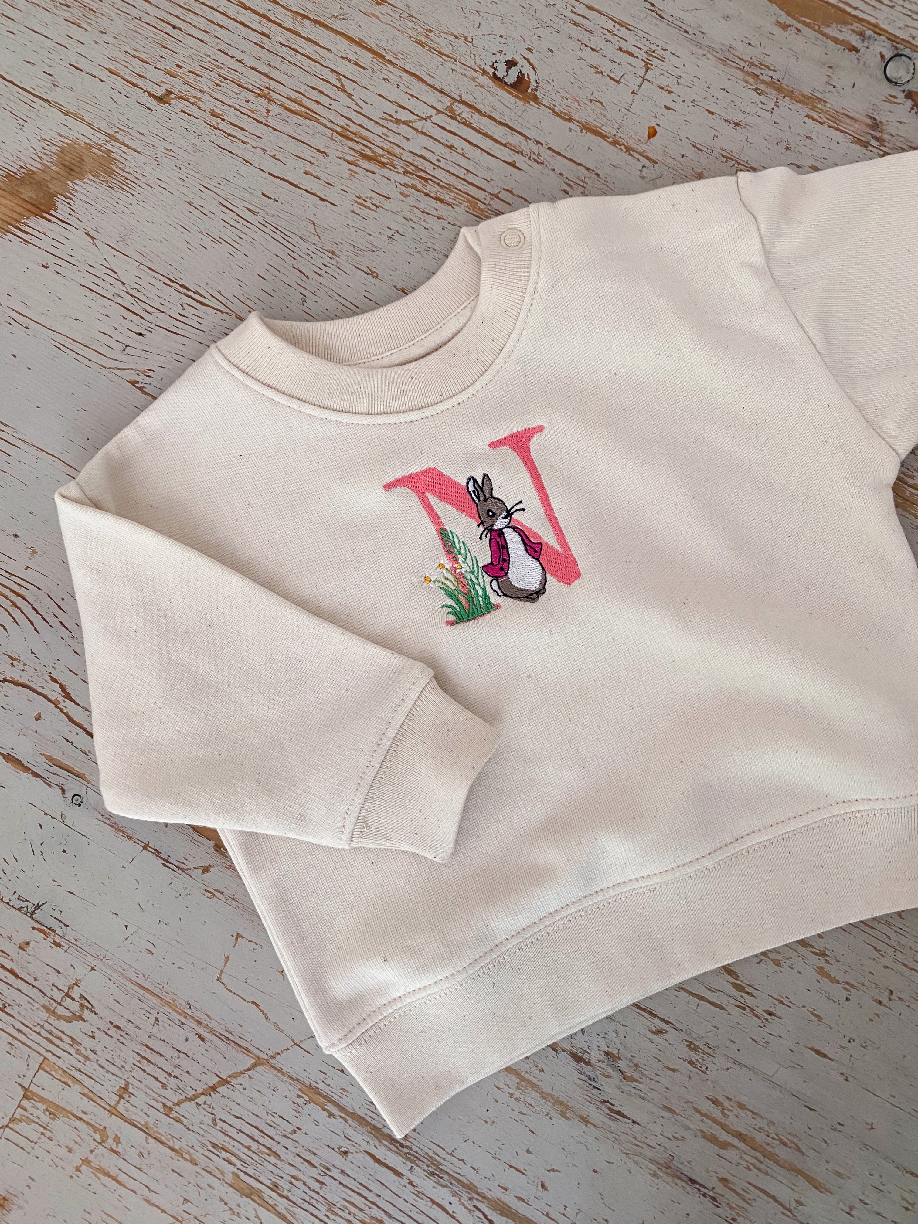 Unsere Kinderpullover eignen sich perfekt zum Besticken mit süßem Häschenmotiv und Anfangsbuchstabe des Kindes.